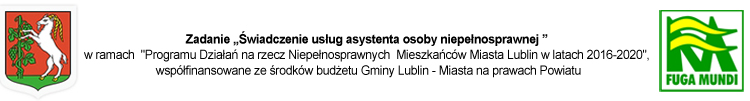 Informujemy, że w okresie od 11 marca do 10 grudnia 2016 r. będziemy realizowali usługi asystenckie dla niepełnosprawnych mieszkańców Miasta Lublina w ramach projektu "Świadczenie usług asystenta osoby niepełnosprawnej", będące elementem "Programu Działań Na Rzecz Niepełnosprawnych Mieszkańców Miasta Lublin w latach 2016-2020".