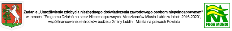 Informujemy, że w okresie od 11 marca do 10 grudnia 2016 r. będziemy realizowali projekt "Umożliwienie zdobycia niezbędnego doświadczenia zawodowego osobom niepełnosprawnym", w ramach "Programu Działań Na Rzecz Niepełnosprawnych Mieszkańców Miasta Lublin w latach 2016-2020".